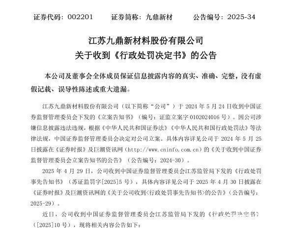 公告显示,江苏证监局认为,前述股票被冻结及拟拍卖事项分别均属于《上市公司信息披露管理办法》规定的应当及时披露的重大事件及应当及时披露的重大事件的进展情况。九鼎新材作为信息披露义务人,未按规定履行信息披露义务,违反《证券法》相关规定,构成违法情形。