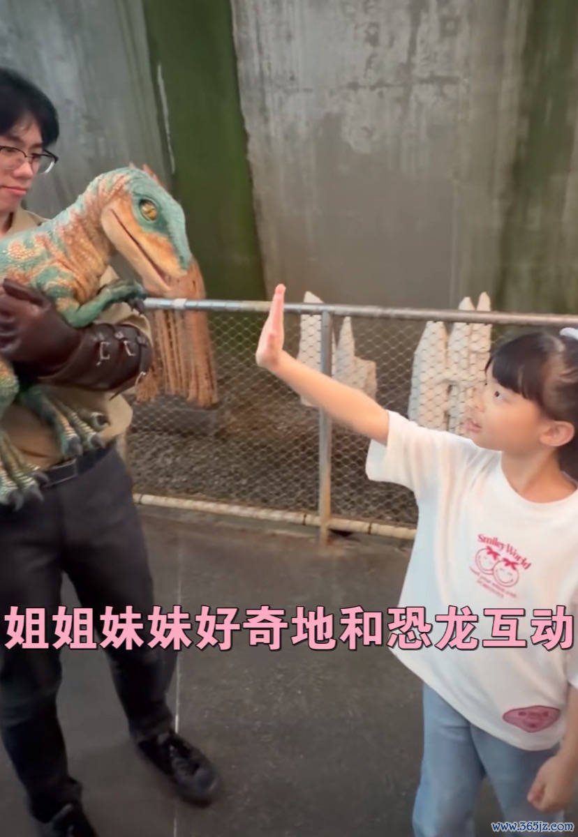 熊黛林的小女儿胆子很大,大方的小恐龙互动,是个很调皮的女孩子。她穿着T恤牛仔裤,休闲又日常。