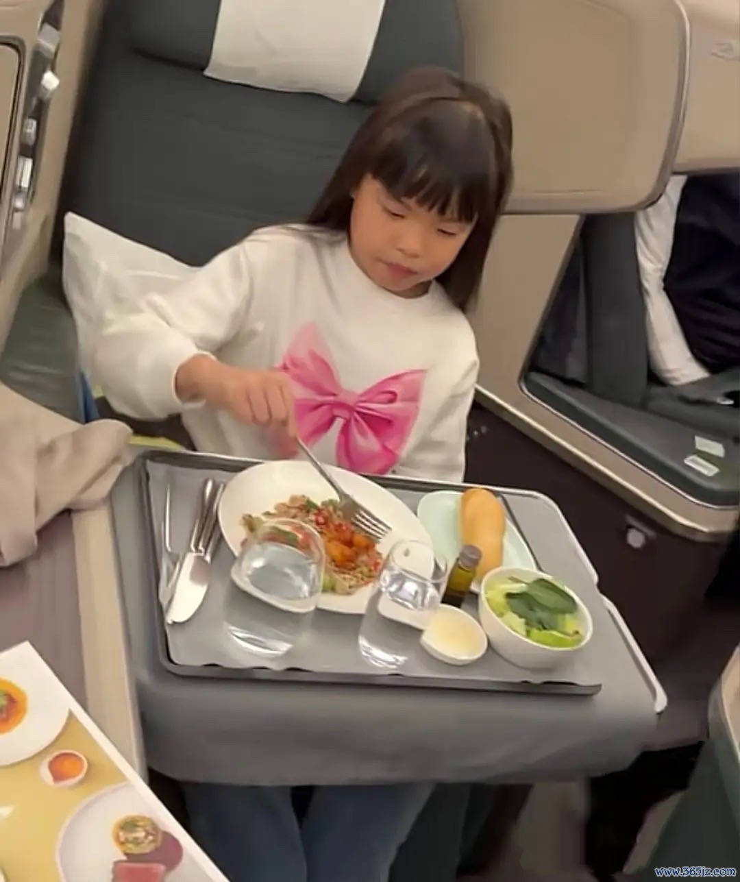姐姐的门牙已经掉了,不过还没有长出新的牙齿。她们在飞机上吃飞机餐,像是一盘蔬菜沙拉,边吃边看平板,乖乖的、不吵也不闹。