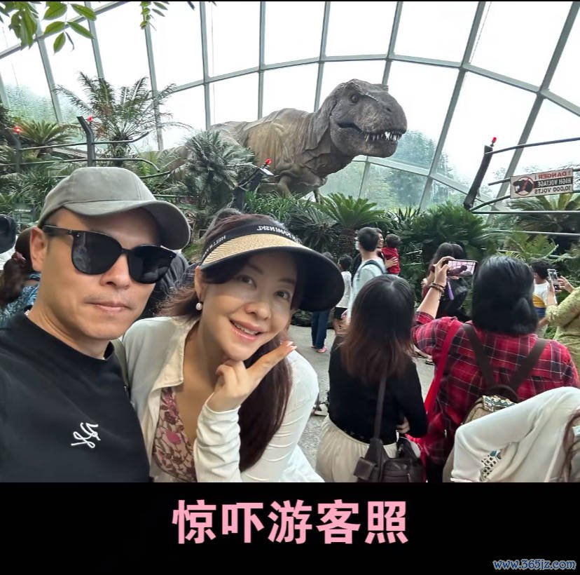 熊黛林和老公还在恐龙背景前拍了比较搞怪的游客照,夫妻俩结婚快10年了,感情一直很稳定。